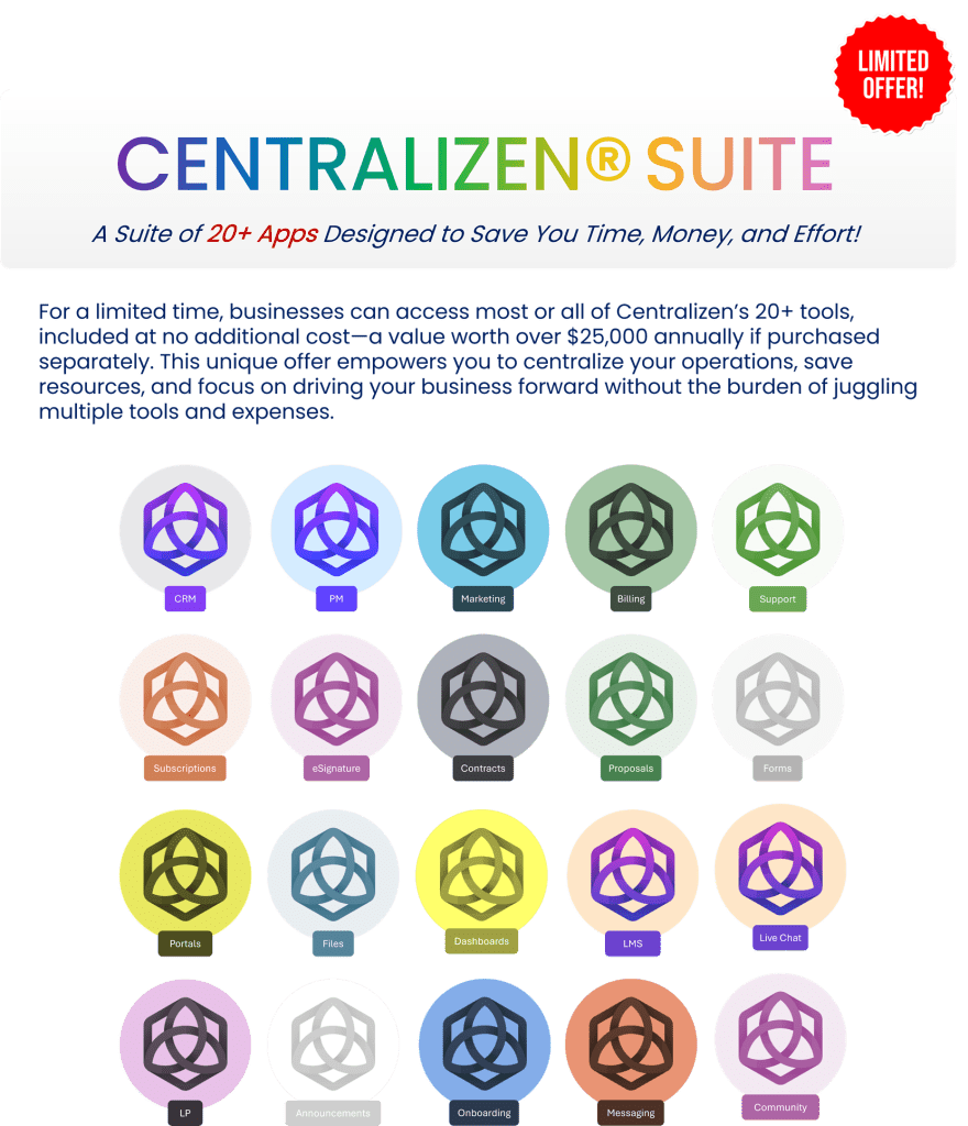 Centralizen is more than a platform; it’s a full ecosystem of 20+ integrated software solutions tailored to your business operations and automation needs. From CRM, project management, and marketing automation to secure portals, eLearning, and client engagement tools, Centralizen unifies and replaces a patchwork of standalone systems. Beyond software, we provide ongoing services, training, and support to ensure your team thrives. The result: a fully branded, seamless experience that scales with you, for clients, employees, and partners alike.