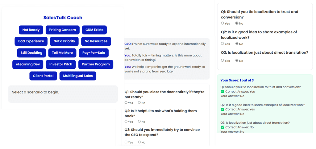 Whether your team sells across multiple industries or regions, the SalesTalk Coach™ can be customized with new scenarios that reflect your evolving products, buyer types, and cultural expectations. It supports multilingual sales environments, making it perfect for global teams. Reps train on their own time, at their own pace, and build the confidence to handle anything from budget objections to strategic partnership hesitations.