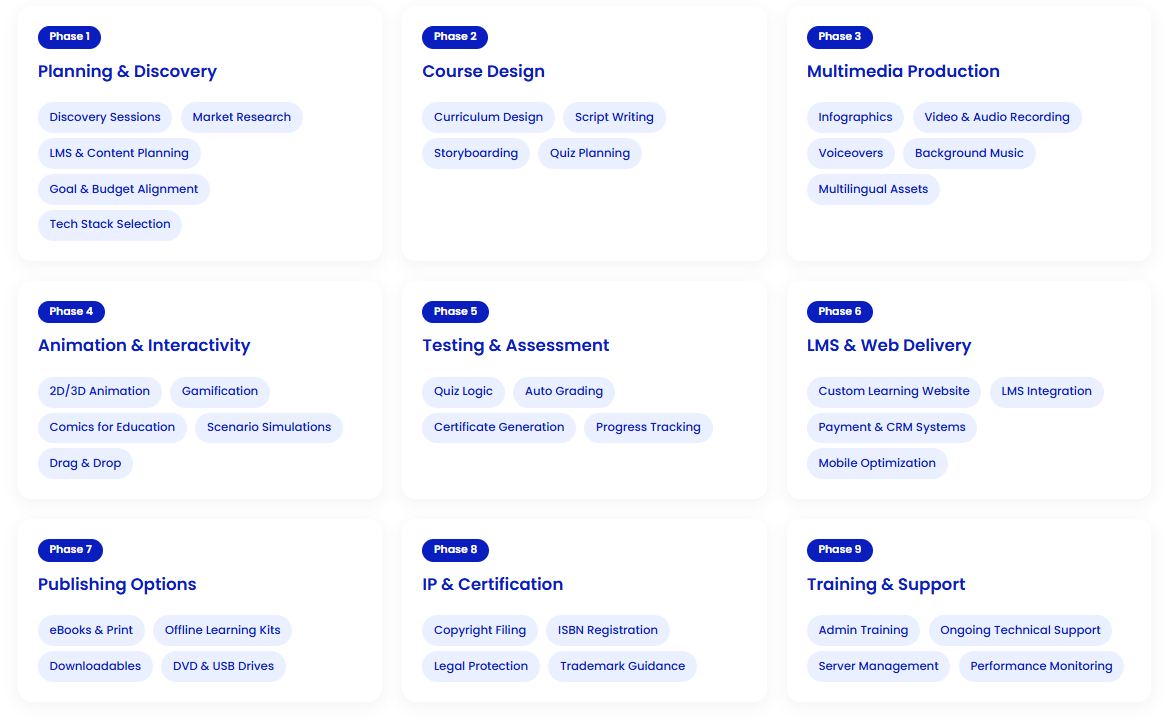 Each eLearning project we deliver follows a clearly structured, phase-based design with measurable deliverables at every step. This ensures full alignment with your goals, transparency throughout the process, and a final product that satisfies both your team and your learners. Quality, clarity, and impact are built into every stage.